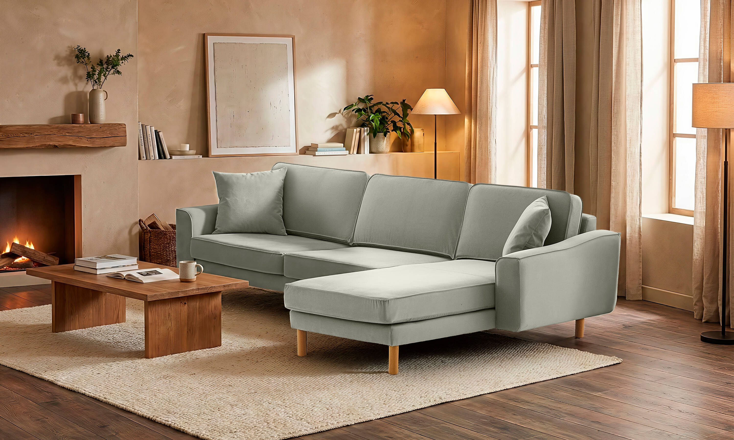 Lotus L Köşe Üçlü Fitilli Kadife Bukle3 Silindir Ayak Açık Ceviz